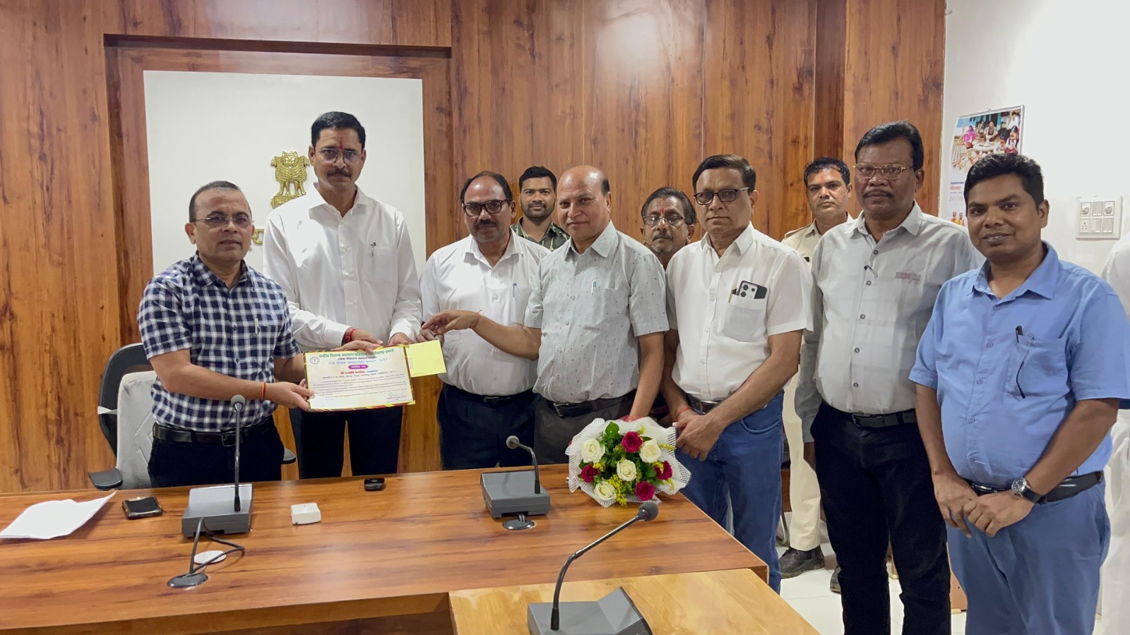 कलेक्टर श्री जनमेजय महोबे ने डॉ. मुकुटधर पांडेय स्मृति सम्मान से सम्मानित शिक्षक राजर्षि पाण्डेय को बधाई एवं शुभकामनाएं दी