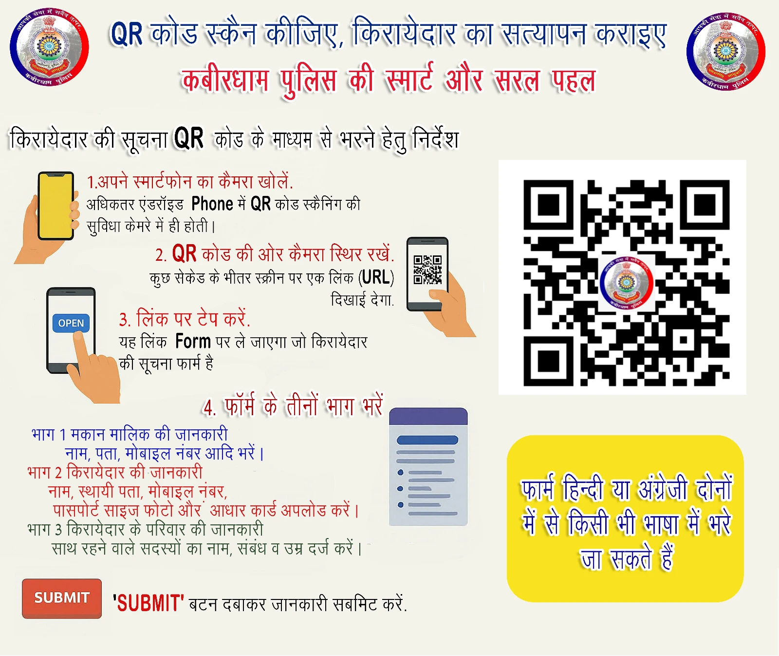 जिले में अपराधों की रोकथाम, संदिग्ध व्यक्तियों की पहचान एवं कानून-व्यवस्था की स्थिति को और अधिक सुदृढ़ करने के उद्देश्य से कबीरधाम पुलिस द्वारा किरायेदारों के सत्यापन की प्रक्रिया को अनिवार्य किया गया है। आमजन की सुविधा को दृष्टिगत रखते हुए सत्यापन की इस प्रक्रिया को सरल एवं सुगम बनाने हेतु कबीरधाम पुलिस द्वारा एक ऑनलाइन फॉर्म तैयार किया गया है, जिसमें मोबाइल से सीधे किरायेदार की जानकारी दर्ज की जा सकती है। इस फॉर्म तक पहुँचने के लिए एक विशेष क्यूआर कोड (QR Code) जारी किया गया है, जिसे स्कैन कर घर बैठे किरायेदार की पूरी जानकारी ऑनलाइन भरी जा सकती है।