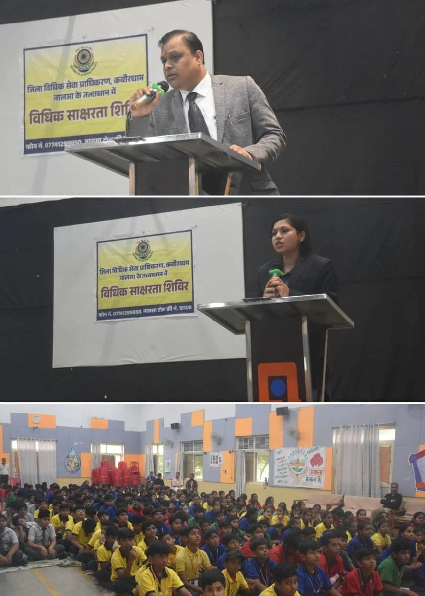 कवर्धा, 30 अगस्त 2025। राष्ट्रीय विधिक सेवा प्राधिकरण द्वारा चलाए जा रहे विधिक जागरूकता अभियान में प्रधान जिला एवं सत्र न्यायाधीश, अध्यक्ष जिला विधिक सेवा प्राधिकरण श्रीमती सत्यभामा अजय दुबे के निर्देशानुसार जिले के सभी स्कूलों में पॉक्सो एक्ट एवं अन्य अधिनियमों के जागरूकता के संबंध में विधिक साक्षरता शिविर का आयोजन किया जा रहा है। अभियान के तहत आज नगर के अभ्युदय हायर सेकेण्डरी विद्यालय में विधिक साक्षरता शिविर का आयोजन किया गया। जिसमें जिला एवं अपर सत्र न्यायाधीश श्री गितेश कुमार कौशिक तथा सचिव जिला विधिक सेवा प्राधिकरण श्री अमन तिग्गा एवं व्यवहार न्यायाधीश सुश्री वर्षा गुर्दे के द्वारा विद्यालय में उपस्थित छात्र-छात्राओं को लैंगिक अपराधों से बालकों का संरक्षण अधिनियम, 2012, मोटरयान अधिनियम, सूचना प्रौद्योगिकी एवं सोशल मिडिया साईट के हानिकारक प्रभाव के बारे में सारगर्भित जानकारी प्रदान करते हुए जागरूकता प्रदान की गई। जिला न्यायपालिका के न्यायाधीशगण द्वारा जिला विधिक सेवा प्राधिकरण के बारे में भी जानकारी दी गई साथ ही पॉक्सो एक्ट के महत्वपूर्ण प्रावधान जिसमें पीड़ित बालकों की गोपनीयता, पीड़ित बालकों के कथन उनकी सुविधानुसार स्थान में दर्ज कराने की व्यवस्था जैसे विभिन्न संरक्षक प्रावधानों के बारे में बालकों को अवगत कराते हुए वर्तमान समाज में विधिक जागरूकता की कमी से होने वाली हानियों को वास्तविक दृष्टांतो का उदाहरण प्रस्तुत कर विद्यालय में लगभग 200 छात्र-छात्राओं को जागरूकता प्रदान की गई। उल्लेखनीय है कि इस दौरान विद्यार्थियों को उनकी जिज्ञासा के अनुरूप उत्तम चारित्रिक विकास व उसके निर्माण हेतु भी प्रेरित किया गया ।